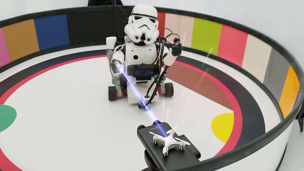 Troopy a few seconds before facing his ‘fear of darkness’ and Skeletor – his arch-enemy.Troopy with arms aloft – laser gun in right hand!Pushing the EV3 brick in place with Lego pins and a velcro patch.Desperate time to make an entrance Troopy!Troopy posing for the camera – small TV in background.Troopy firing his laser at his nano drone. This is just a fun effect one can drop in using the video editing software I use (Hitmaker Express – it’s free). This has nothing to do with my brain model or what I am trying to demonstrate. It does make for some welcome comic relief during my studies of the brain. Troopy getting use to using the Head Up display (HUD) Panel with buttons.